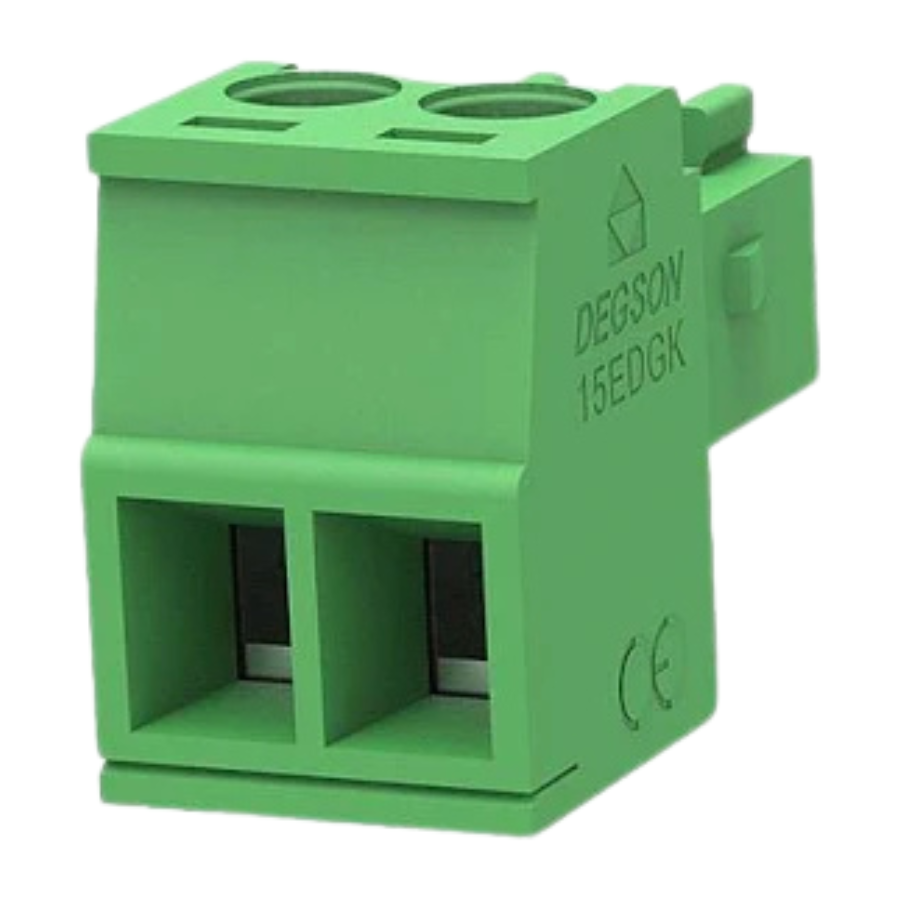 Terminal block de 2 polos con paso de 3.5mm para montaje en PCB.